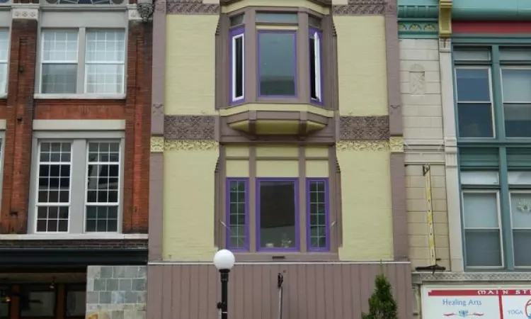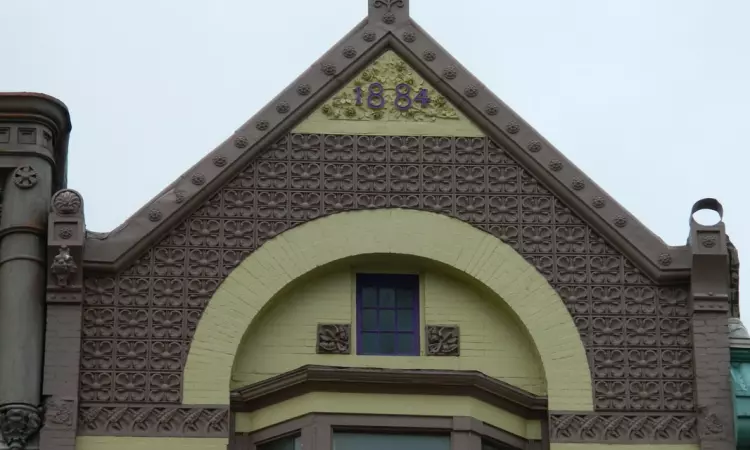 The upper floors were composed of single bay windows, topped by large molded brick. Additionally had a relieving arch set in a tall Norman-style gabled parapet.
