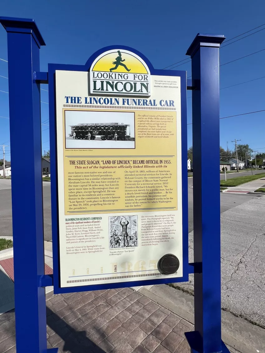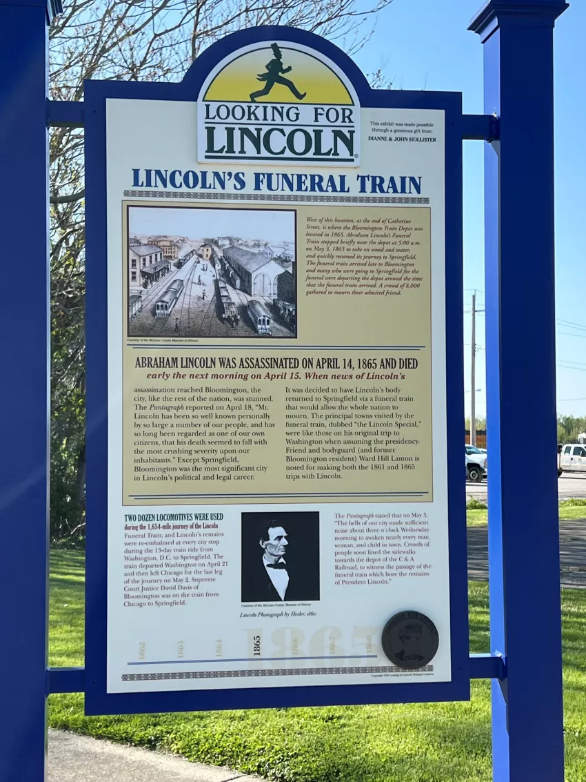 Abraham Lincoln’s Funeral Train stopped briefly near the Bloomington Train depot, just west of this location, at 5:00 a.m. on May 3, 1865, to take on water and wood, and quickly resumed its journey to Springfield. When the train arrived bells rang, and a crowd of 8,000 people gathered to witness train and mourn their admired friend.
